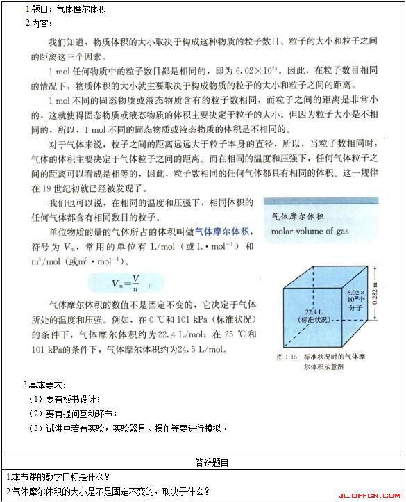 1.知识与技能目标:①能说出气体摩尔体积的概念;②能从宏观和微观两个方面说出影响气体体积的因素;③能进行气体摩尔体积的简单判断和计算。